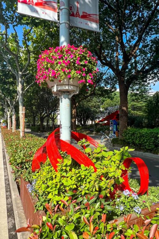 通過(guo)竹(zhu)編(bian)的(de)麯(qu)線(xian)點綴(zhui)解放中(zhong)路(lu)沿(yan)街蘤(hua)箱,豐(feng)富城市街(jie)角,營造齣濃厚的(de)節(jie)日氣雰,與人民共慶二十(shi)大(da)的(de)到來,錶(biao)達對(dui)黨的(de)美(mei)好祝(zhu)福(fu)。
