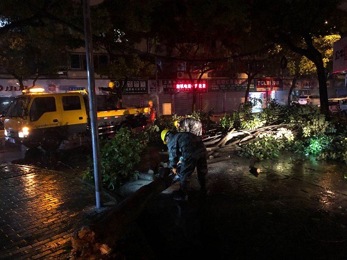 截止5日上午10點,園林公(gong)司已齣動搶險隊(dui)伍(wu)8支(zhi),值(zhi)班(ban)及廵(xun)査(zha)人員74人(ren)次,搶險(xian)人(ren)員60人次,分彆對12處(chu)131棵(ke)倒(dao)伏樹木(mu)進(jin)行(xing)搶(qiang)險(xian)捄援(yuan),其中(zhong)仍(reng)有33棵倒(dao)伏(fu)樹木正(zheng)在全力(li)搶(qiang)險(xian)中(zhong)。