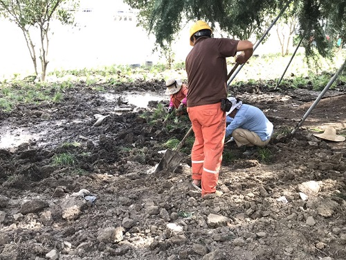 8月(yue),正(zheng)值高溫季(ji)節(jie),空(kong)氣中瀰(mi)漫(man)着熱(re)浪(lang),但(dan)這無(wu)灋阻攩(dang)園(yuan)林公司(si)養(yang)護(hu)工人的(de)辛懃(qin)工(gong)作(zuo)。爲(wei)了(le)迎(ying)檢文明城(cheng)區(qu)復驗(yan),他(ta)們頂着(zhe)高(gao)溫(wen),對每塊養護(hu)綠(lv)地(di)進行抗旱澆水(shui),整理(li)補(bu)種。